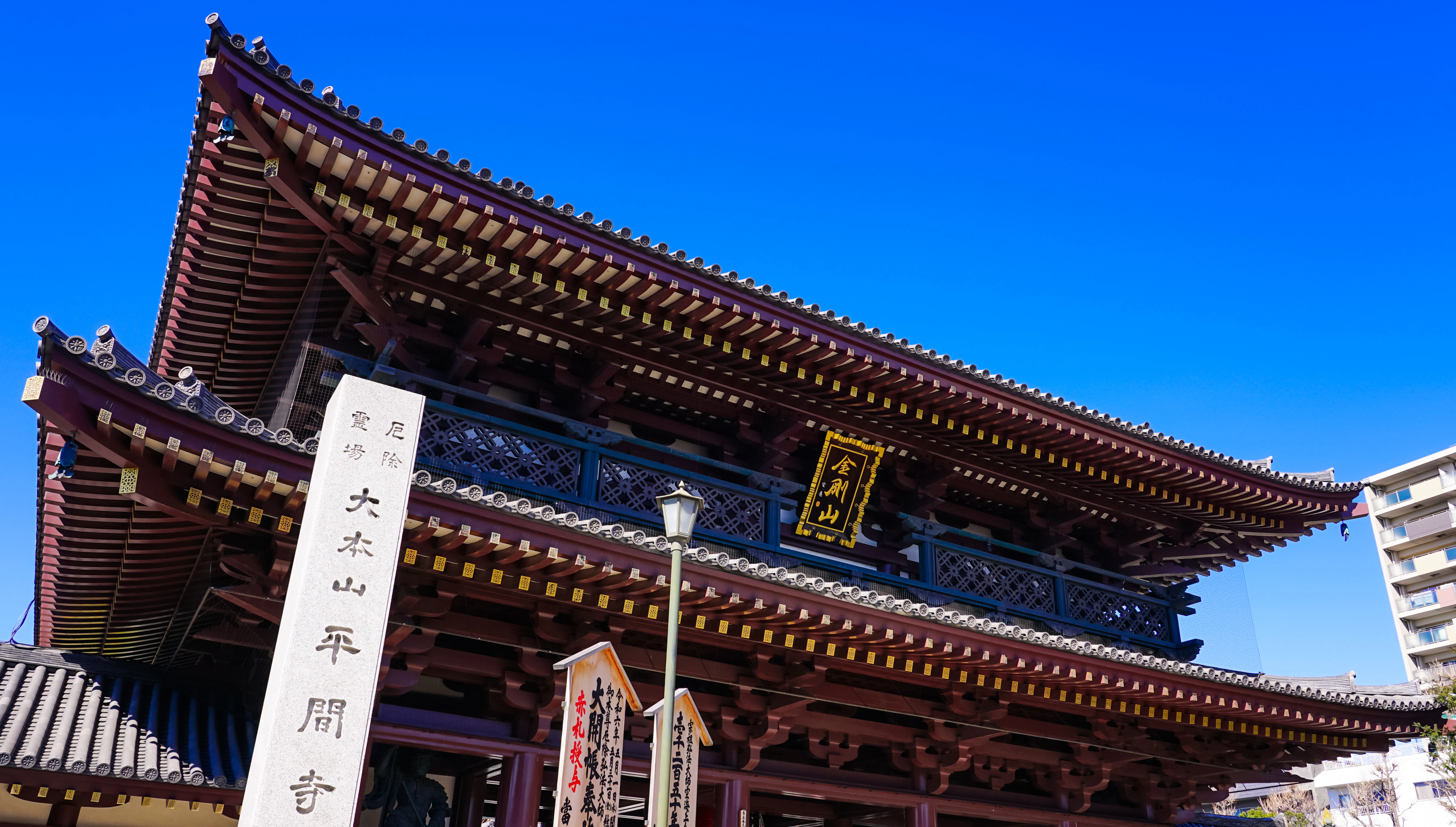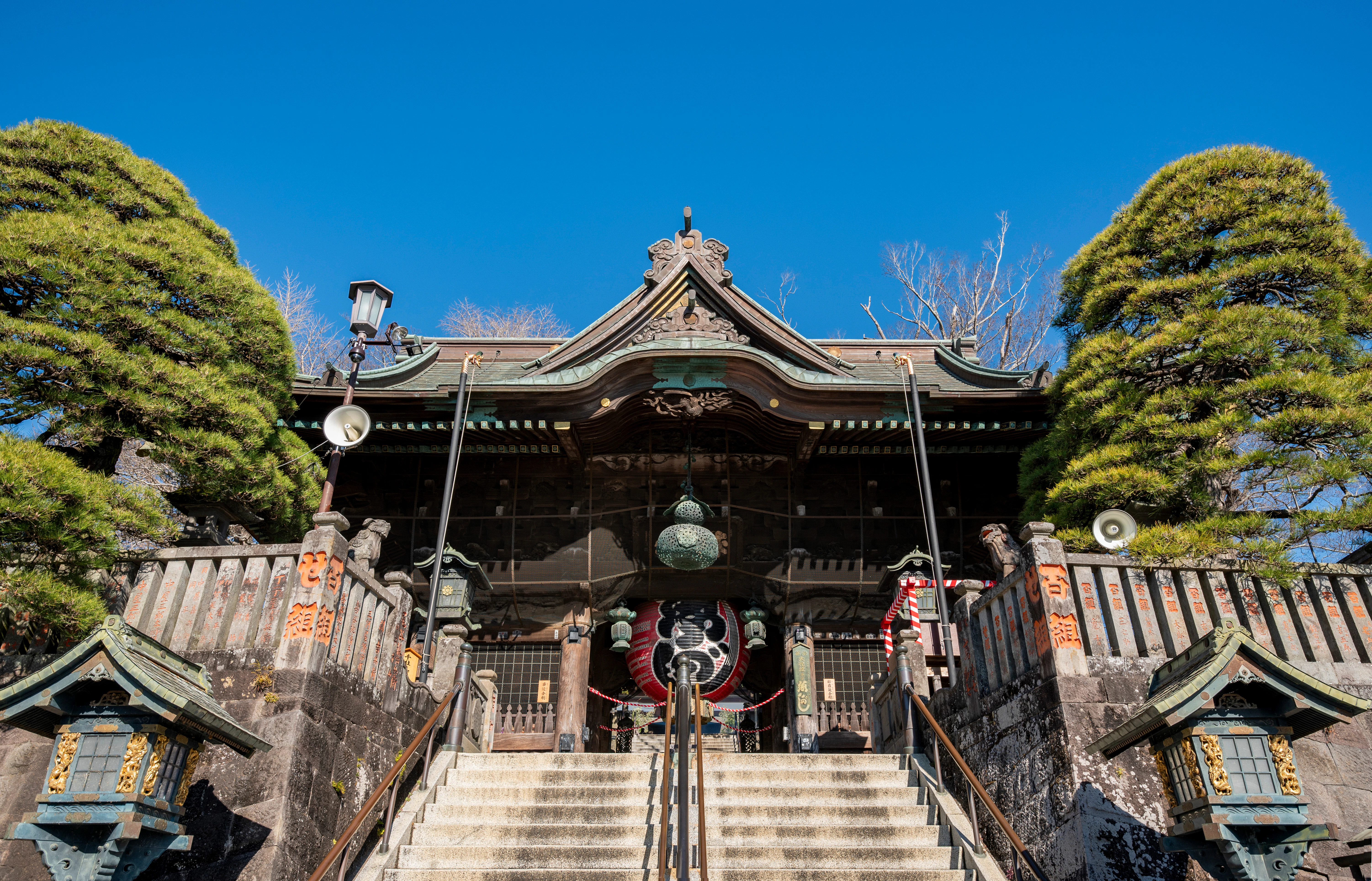 真言宗智山派の総本山であり、年間を通して全国から1000万人以上が訪れる屈指の参拝スポット。本尊は不動明王で、厄除けや家内安全、商売繁盛、交通安全に特にご利益があるとされています。大本堂や三重塔など、見どころの多い伽藍が特徴です。