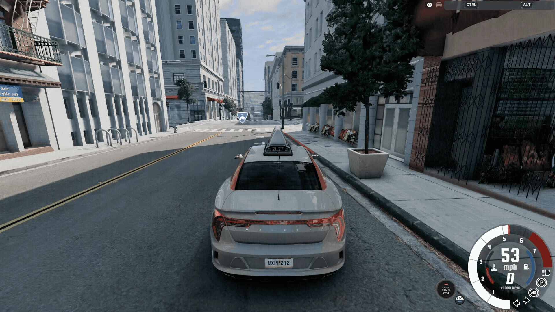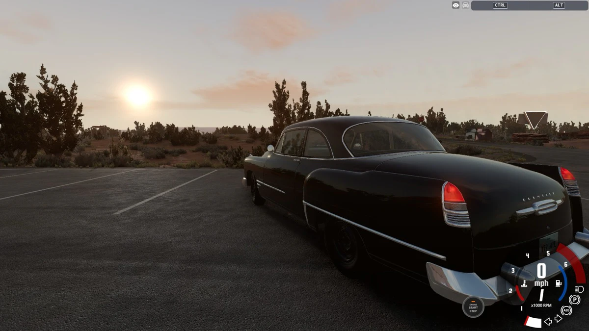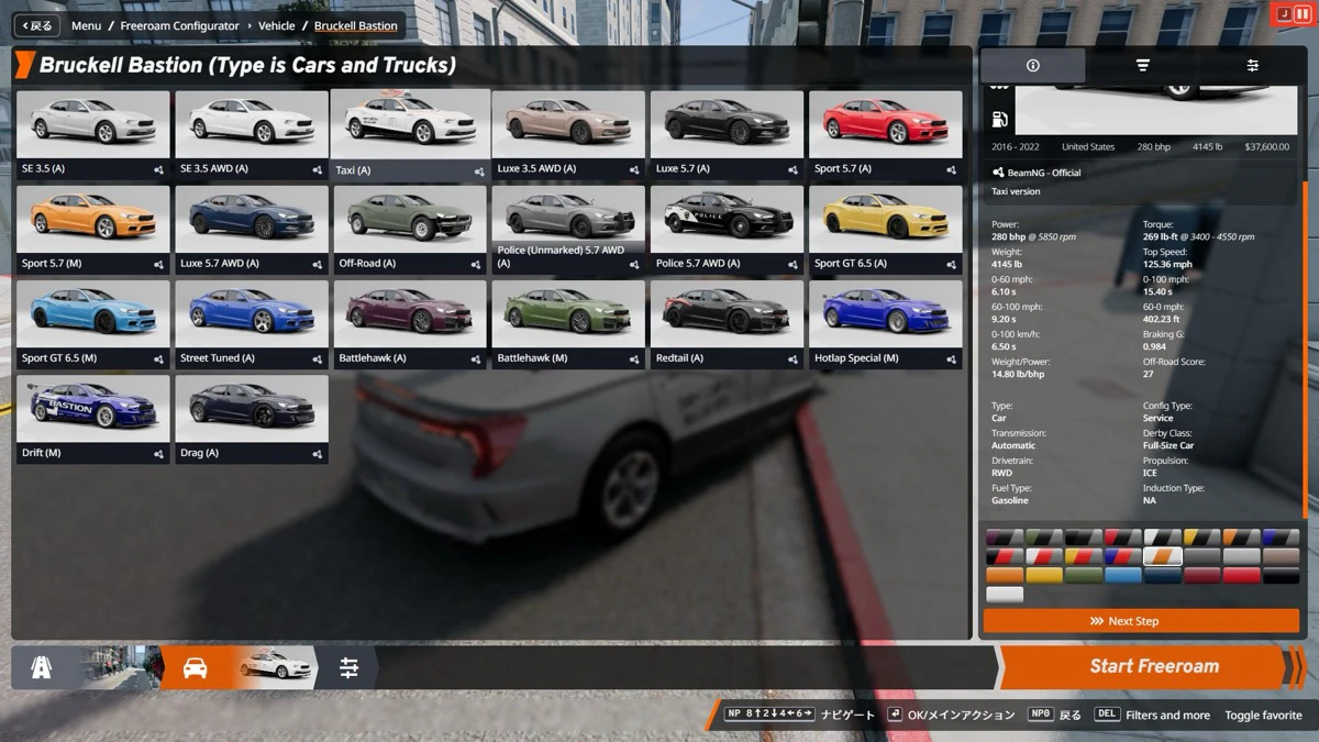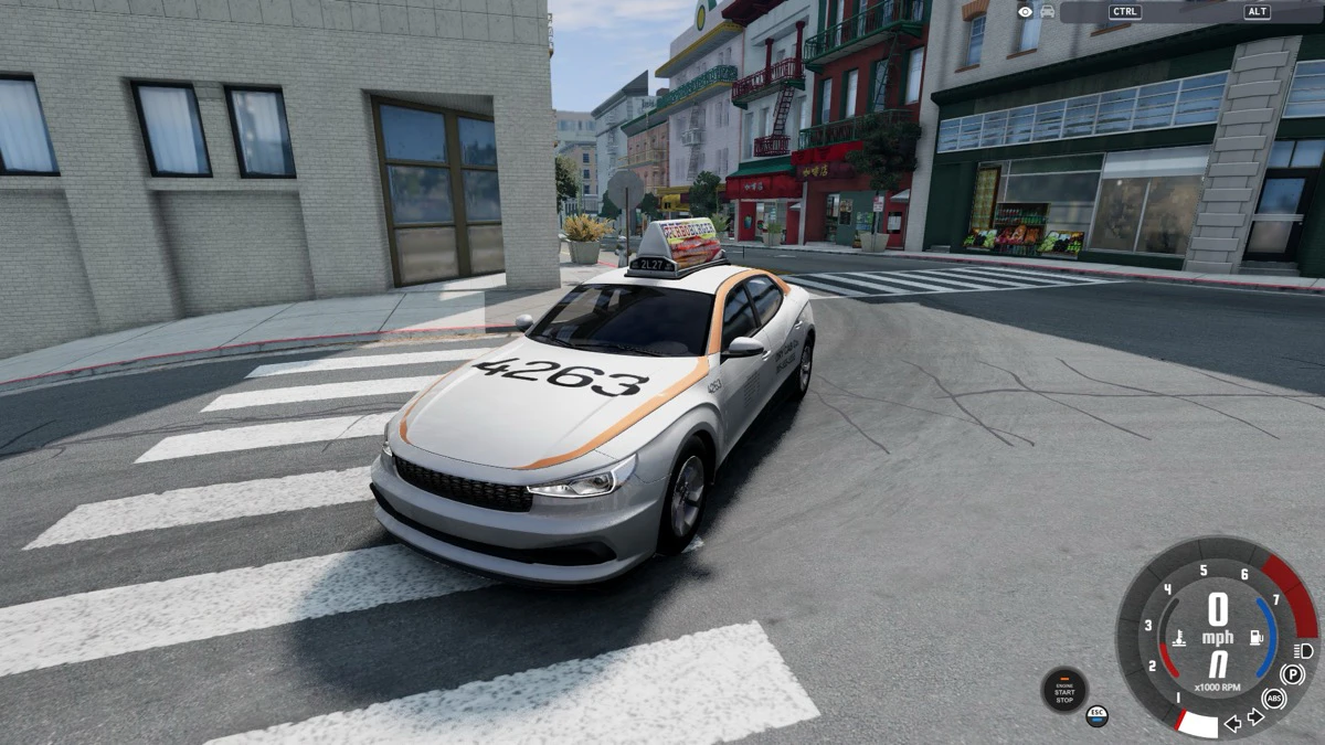 やり方はいたって簡単。まずは『BeamNG.drive』を起動し、メインメニューから自由に走り回るフリ-ロームモードを選択しましょう。お好きなコースを選択し、お好きな車を選択。今回はコースに西海岸のチャイナタウン、車は一般的なセダンタイプのタクシーを選んでみました。