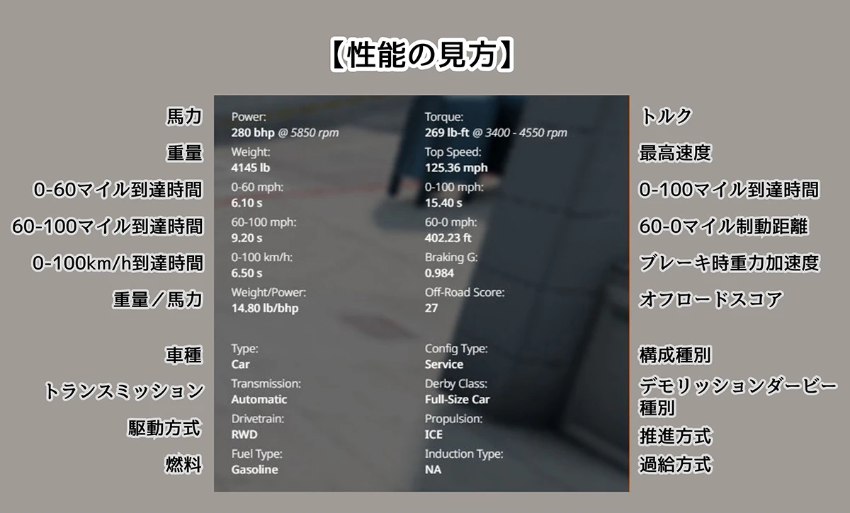 まずはこちらの画像をご覧になってください。これは『BeamNG.drive』の車種選択画面。左側に並んでいるのが選べる車種で、右側に並んでいるのがその車のスペック表です。