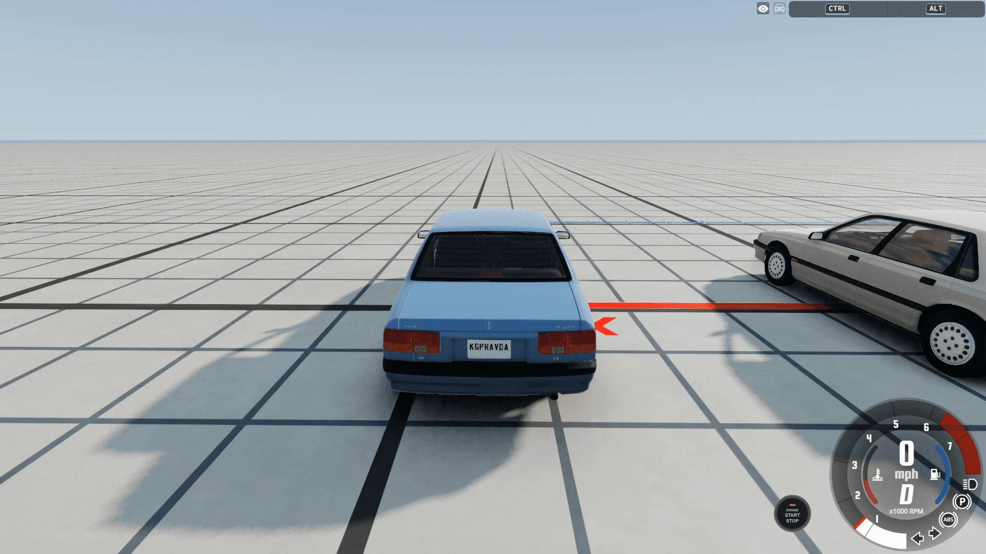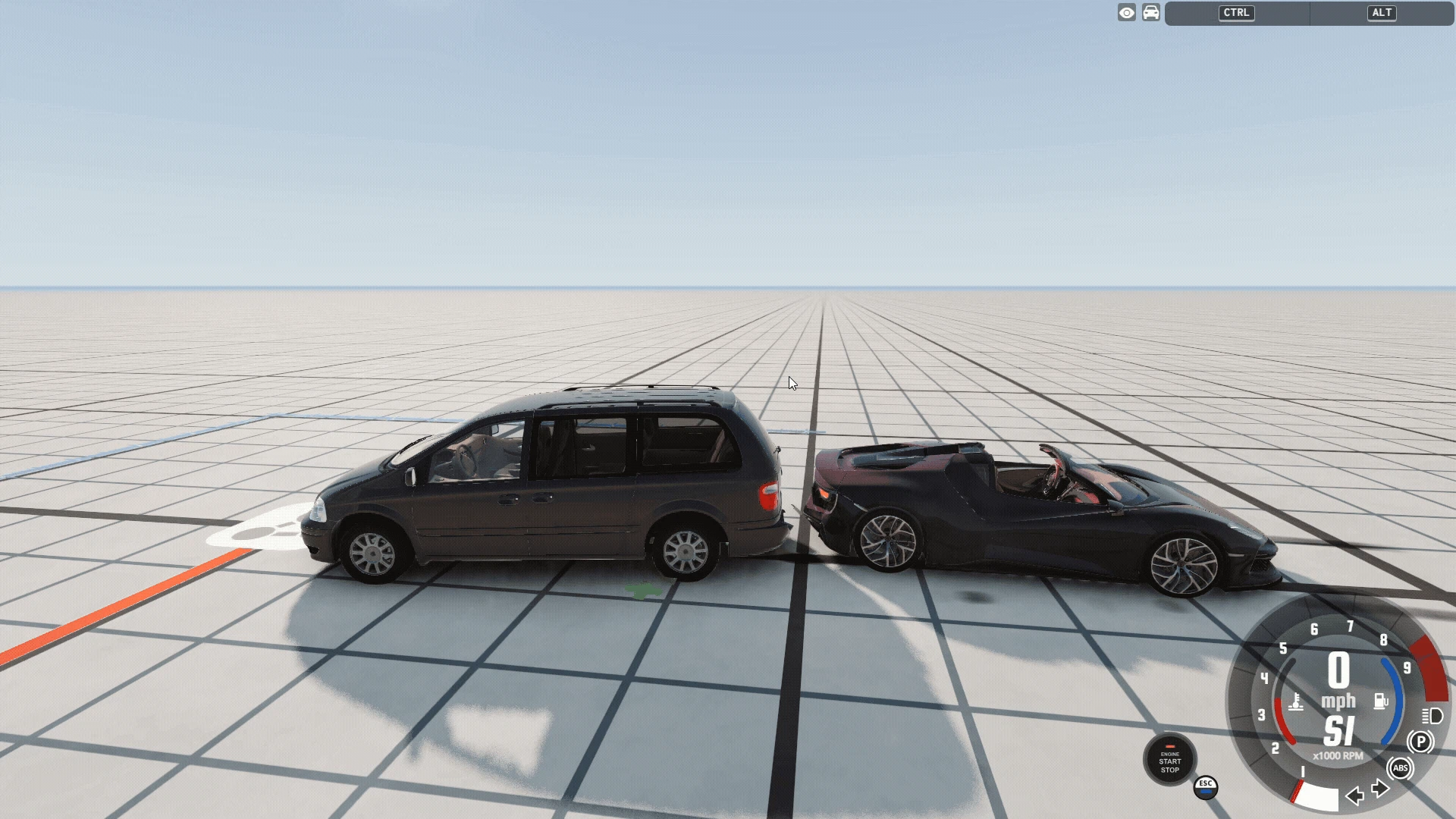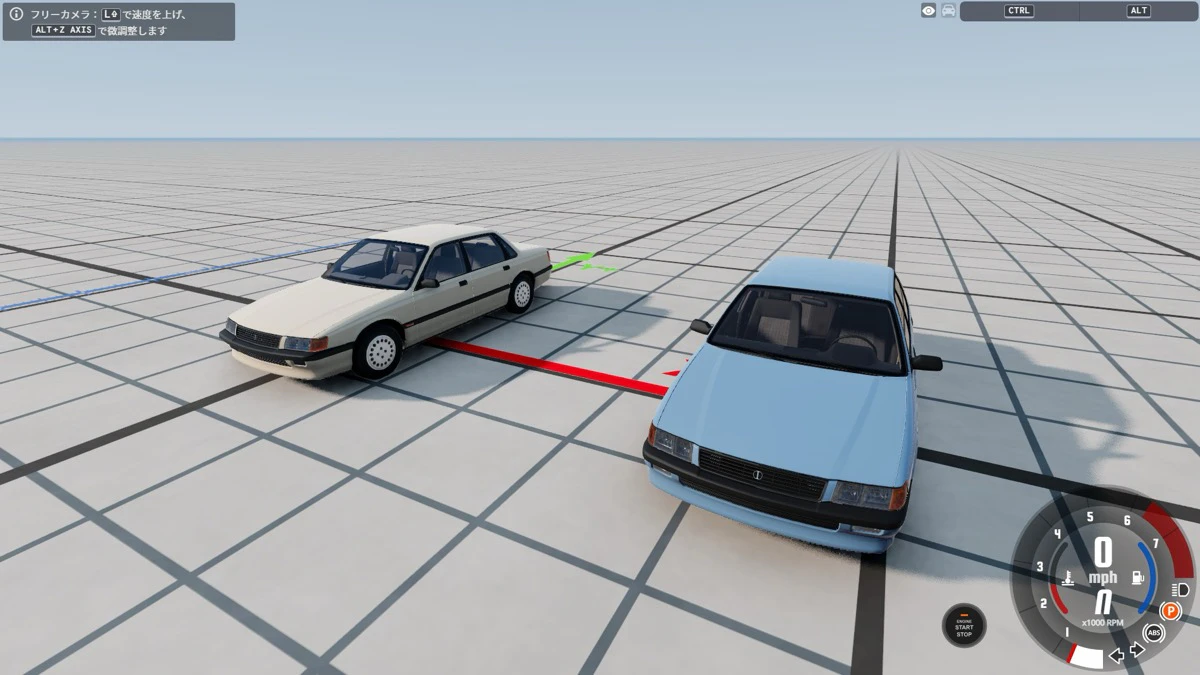 車同士に単純な力比べをしてもらうなら、やはり車同士で綱引きをしてもらう他ありません。今回はファミリーに人気のワゴンと、スポーツカーの二台を用意しました。車と車を背中合わせに並べたら、Ctrlキーを押してみましょう。車体全体に緑色の円が表示されるようになります。