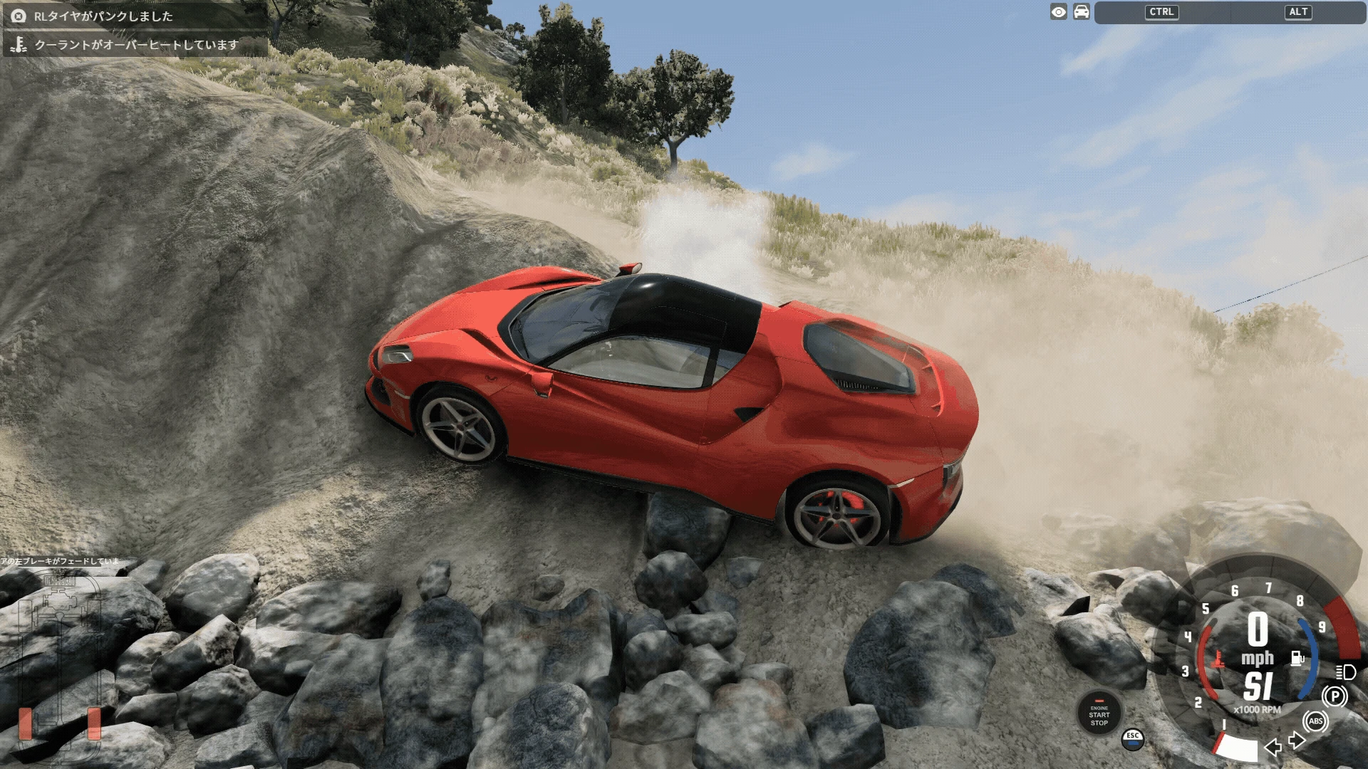 『BeamNG.drive』にはAIに車を動かしてもらうオプションがあるので、今回はそれを利用しましょう。Eキーを押して表示されるラジアルメニューから、「AI」を選択し、「逃げろ」を指示してみましょう。AIの車は、貴方の車を引きずったまま一目散に走り出すようになります。