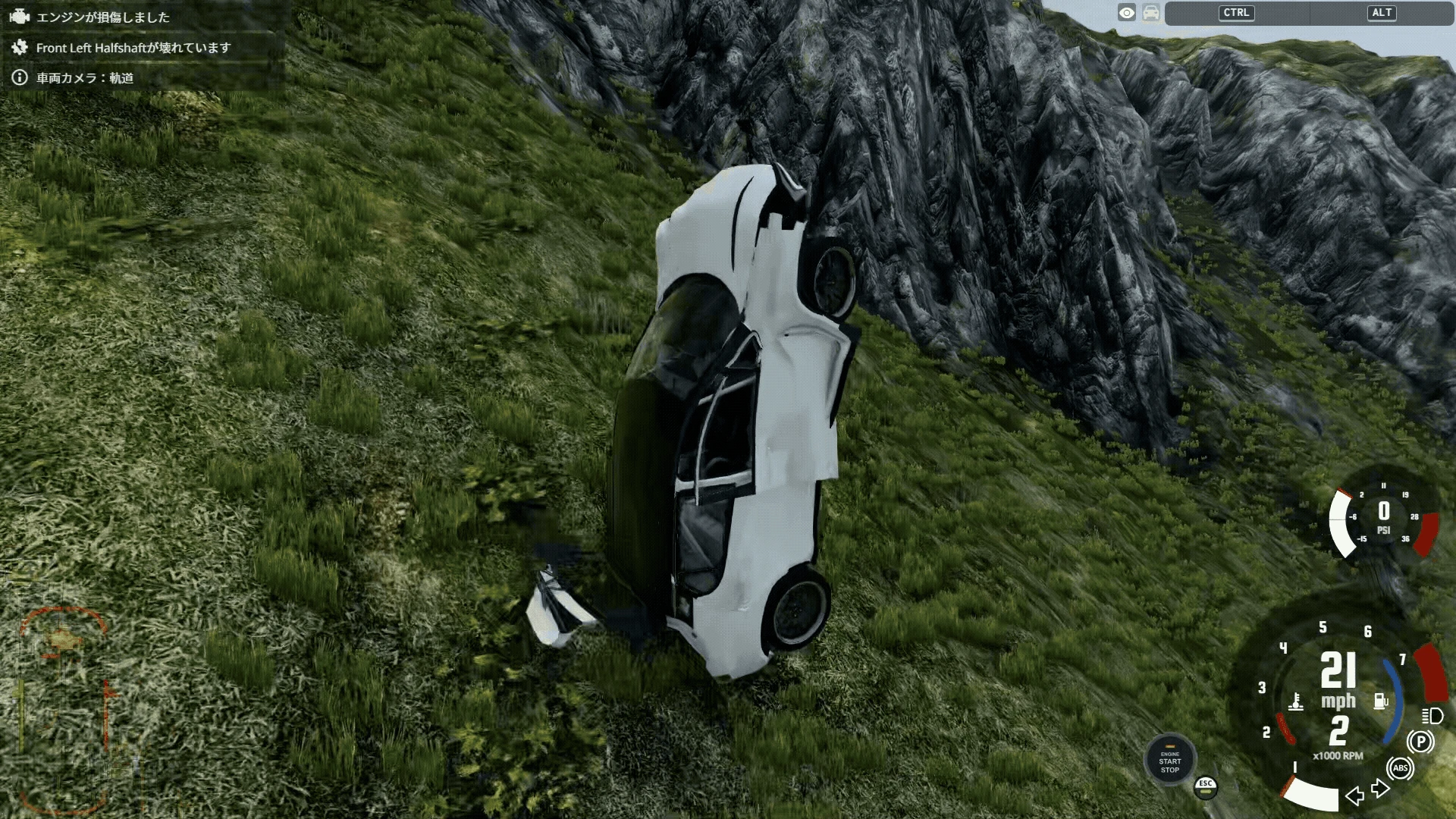 『BeamNG.drive』にはAIに車を動かしてもらうオプションがあるので、今回はそれを利用しましょう。Eキーを押して表示されるラジアルメニューから、「AI」を選択し、「逃げろ」を指示してみましょう。AIの車は、貴方の車を引きずったまま一目散に走り出すようになります。